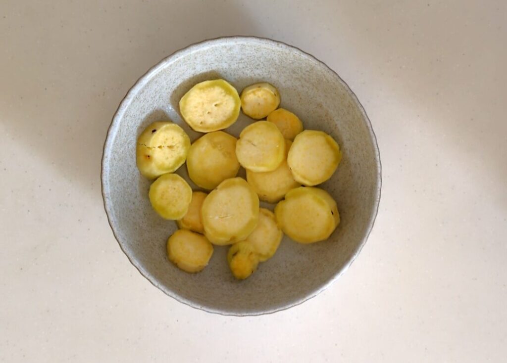 ①さつまいもの皮をむいて約1cm幅の輪切りに切る