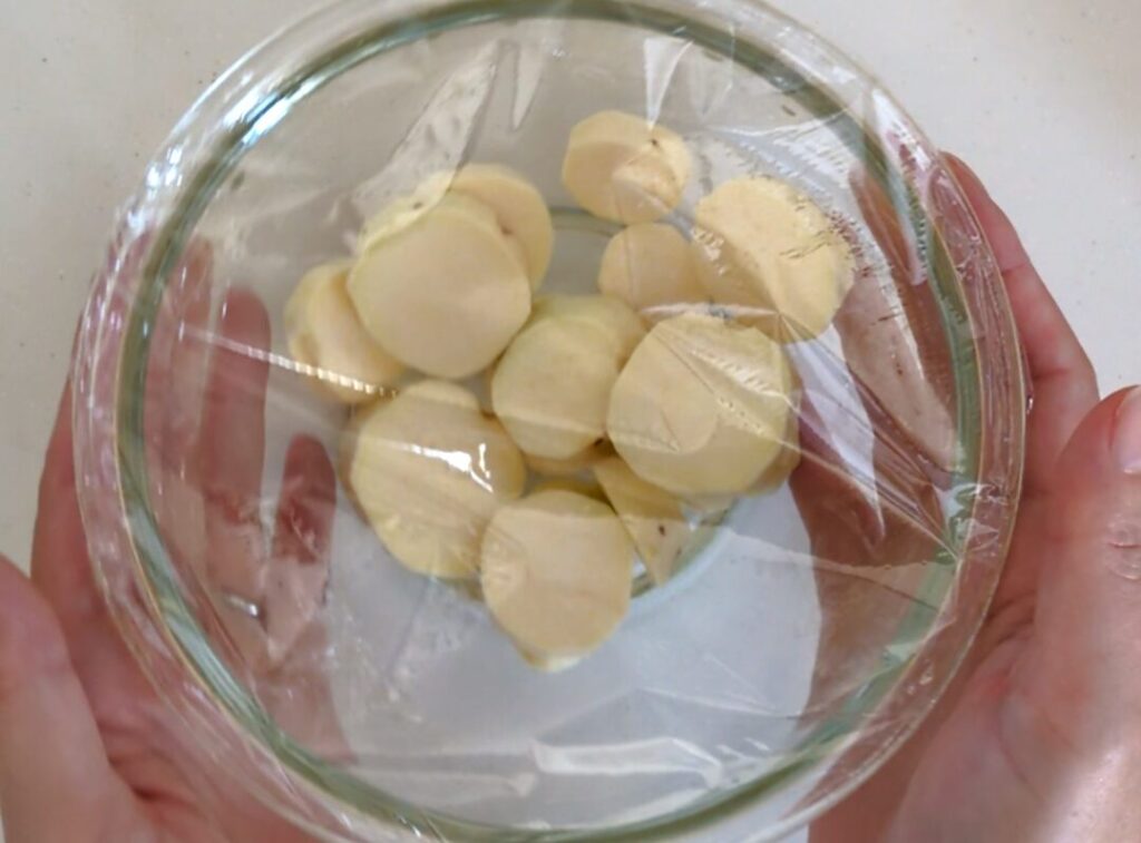 耐熱ボールに塩水を用意して、さつまいもを入れて10分程浸水させる