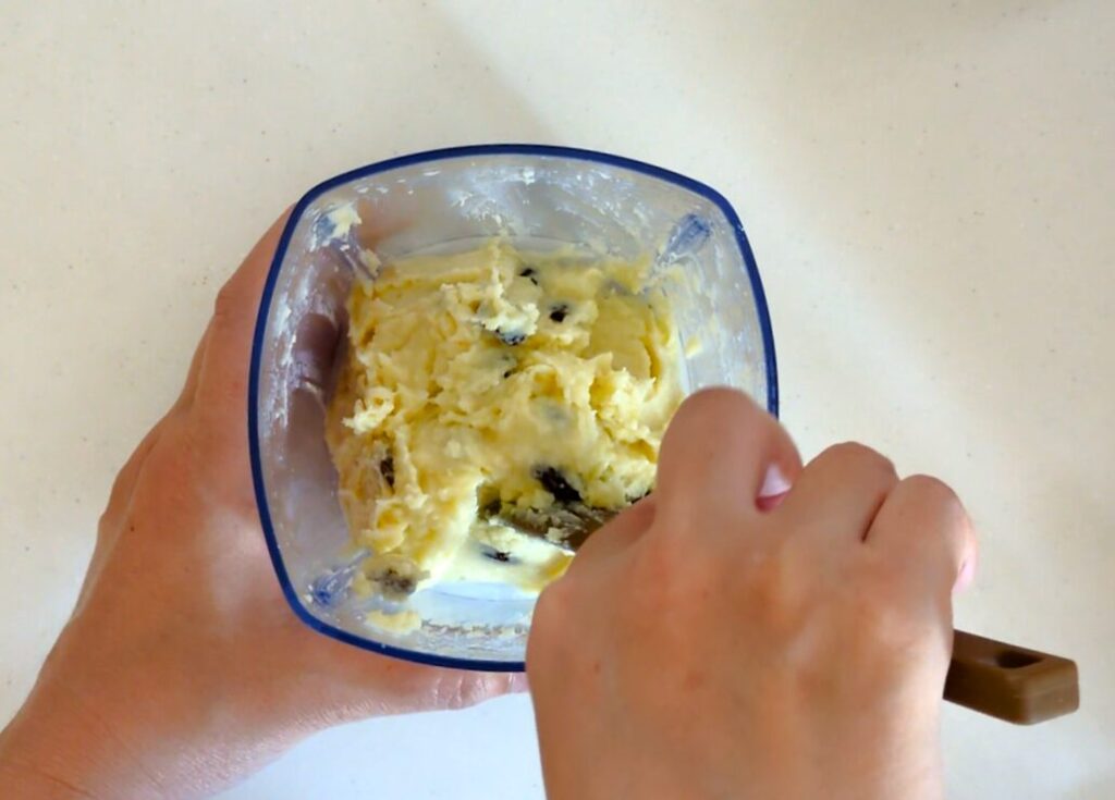 フードプロセッサーがない場合は、フォークやスプーン等でさつまいもの塊がなくなるまで潰してしっかり混ぜ合わせましょう。