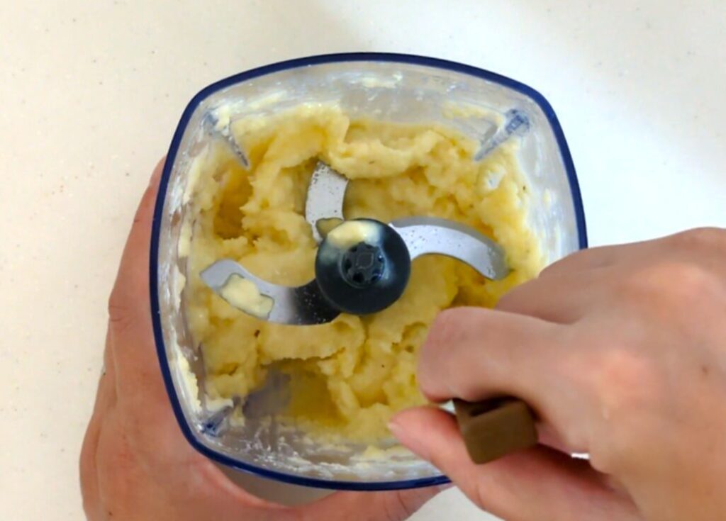 ⑦塊がなくなり混ぜ合わさったらフードプロセッサーの刃を取り除く