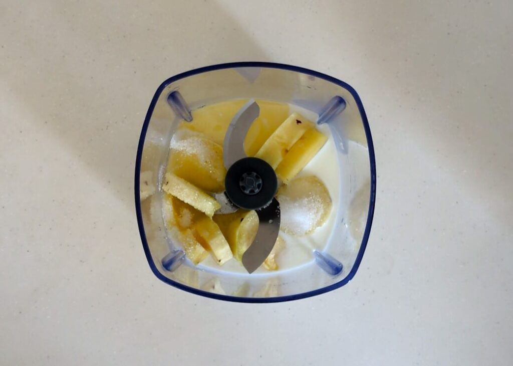 ⑤フードプロセッサーの容器に粗熱が取れたさつまいもと牛乳、溶かしバター、砂糖を入れて1回目の攪拌
