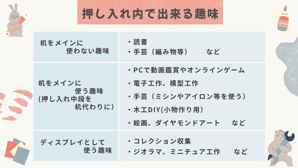 室内で行う趣味の中でも、このように押し入れ内で使うレイアウトパターンはさまざまです。