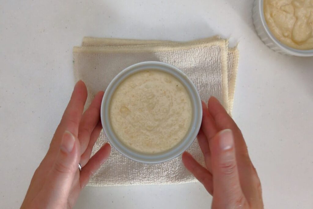 布巾の上でカップを落とすようにトントンして気泡を出していきましょう。