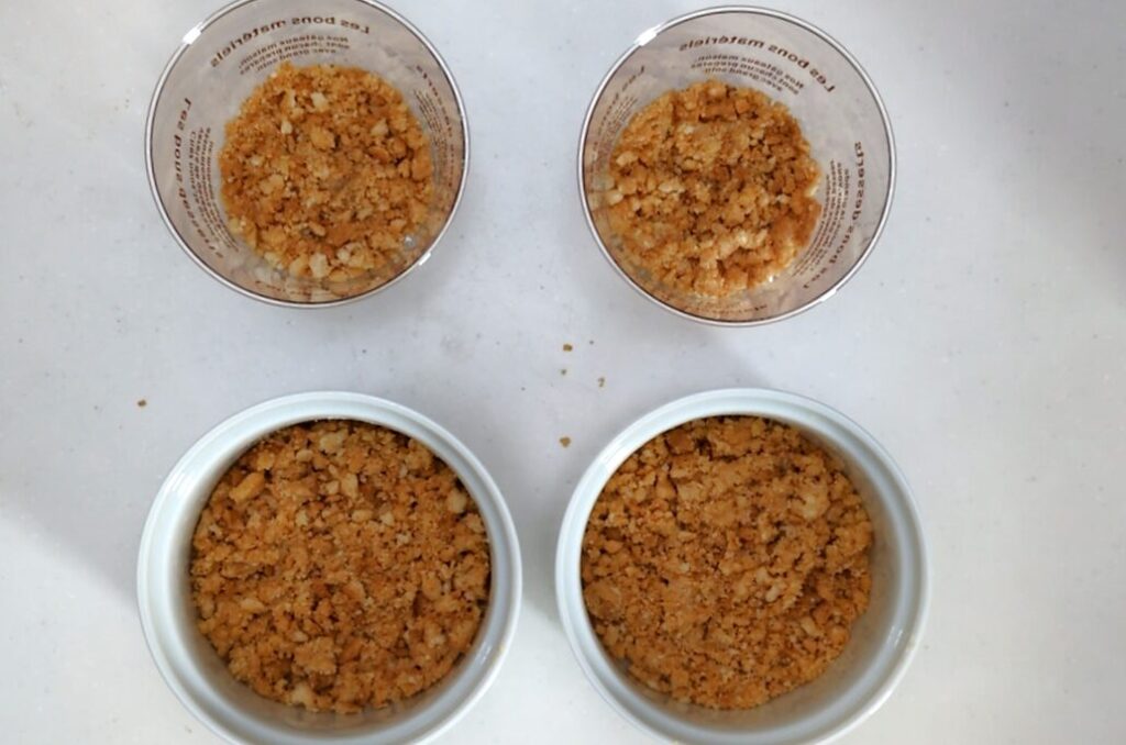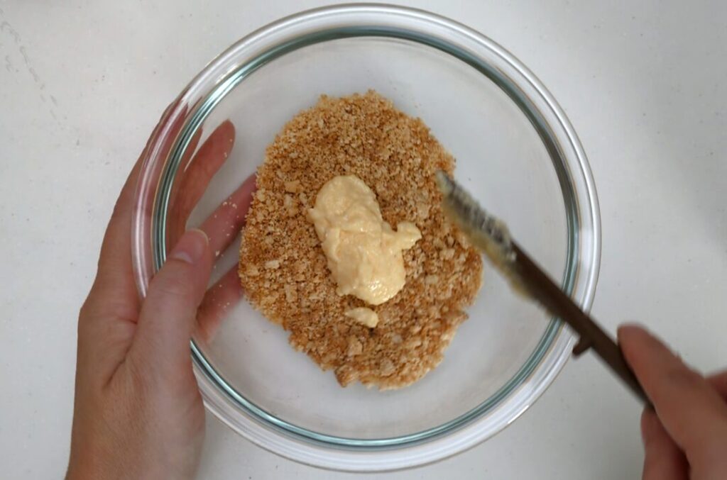 ④③を大さじ1すくい、①の砕いたクッキー内に入れてクッキーが少ししっとりするまで混ぜ合わせる