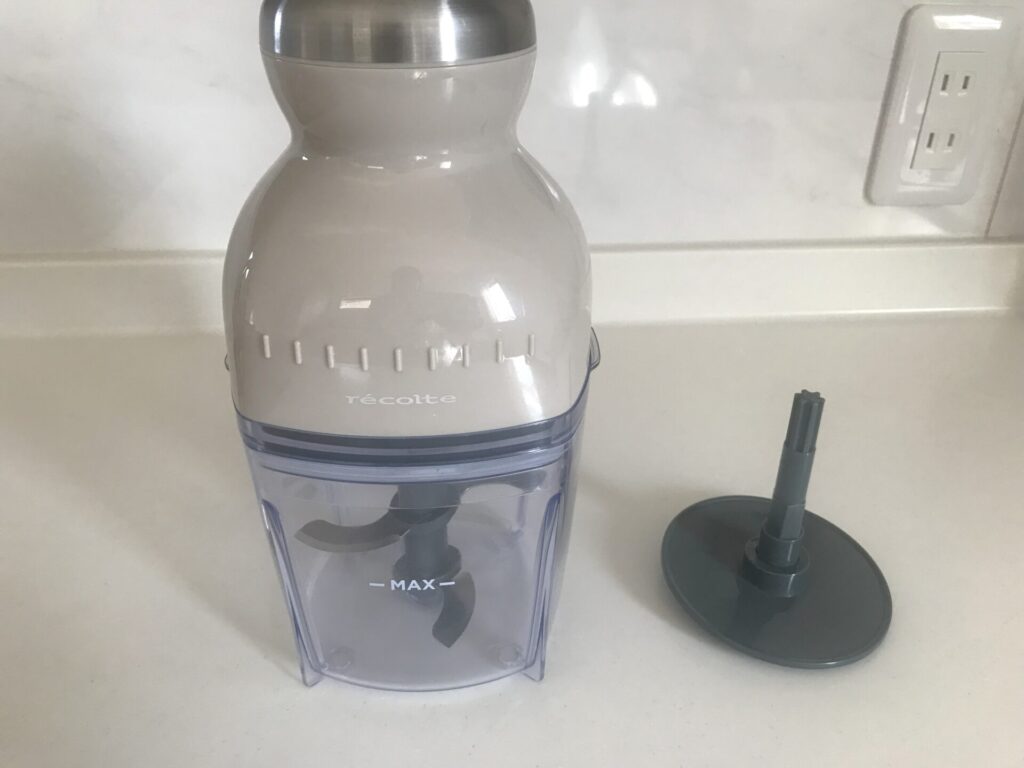 このフープロは、左(セット済の方)で細かく刻むブレード刃、右のパーツ(泡立てプレート)に付け替えるとホイップができます。