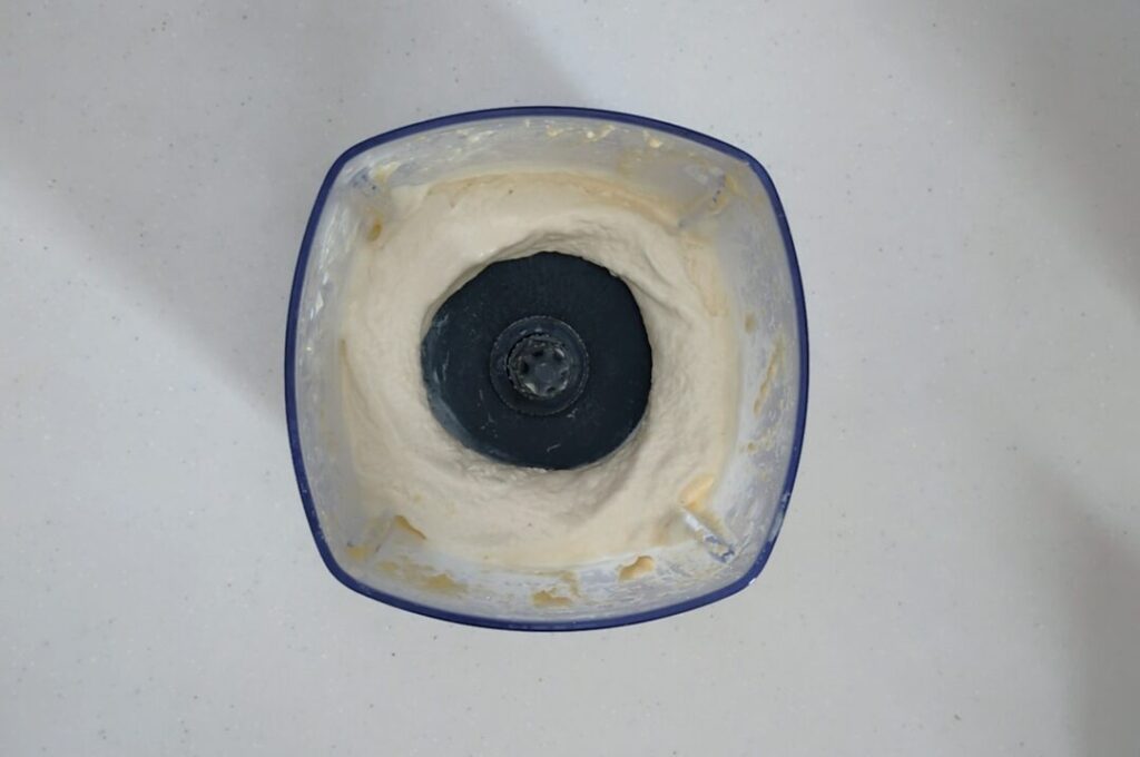 ⑥フードプロセッサーに生クリームと砂糖を入れて、ツノが立つくらいまで攪拌する
