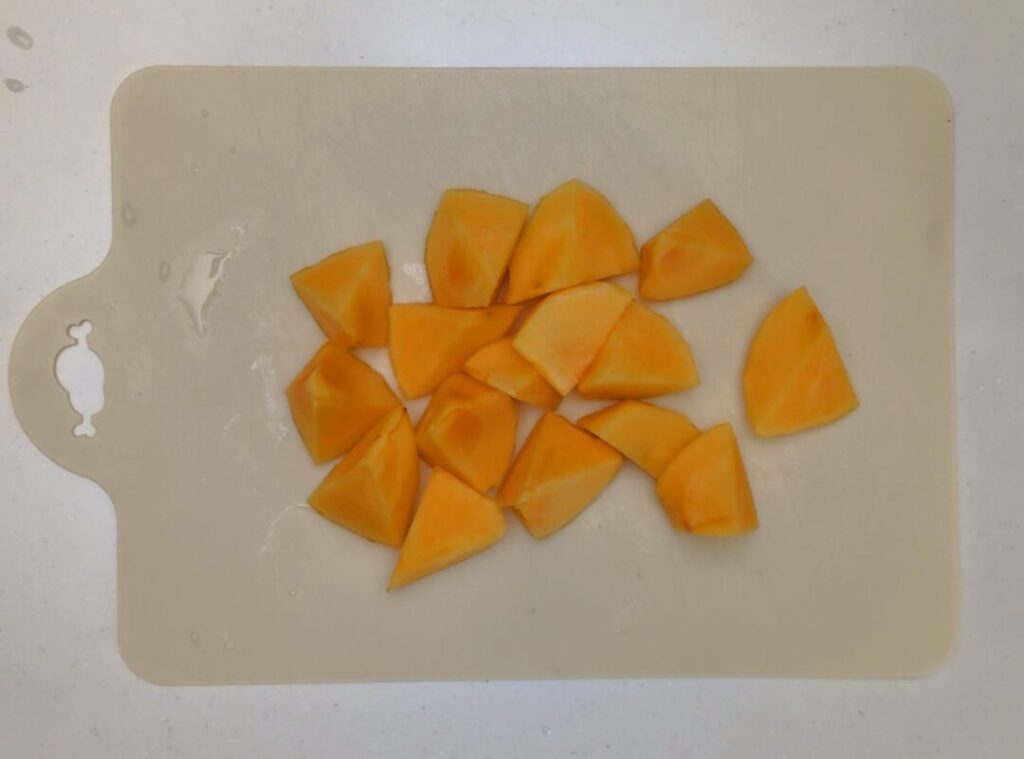 入れないと見た目のオレンジっぽい鮮やかさがなくなり、茶色くなってしうので注意です。