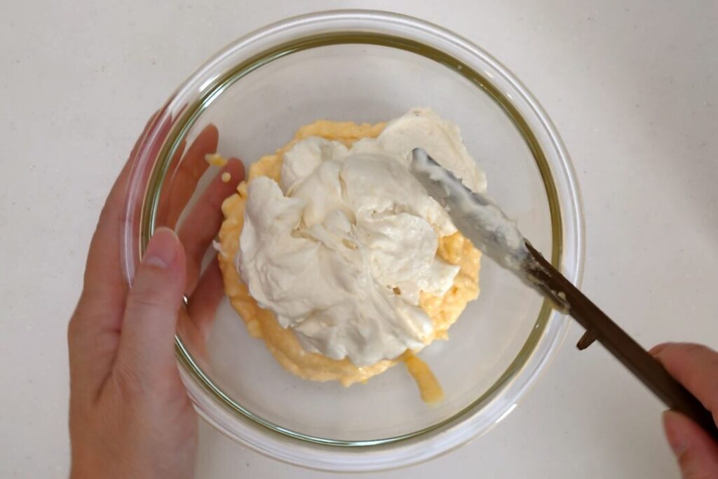 ⑦ボール内の柿クリームチーズの上に⑥を入れて、さっくり混ぜ合わせる