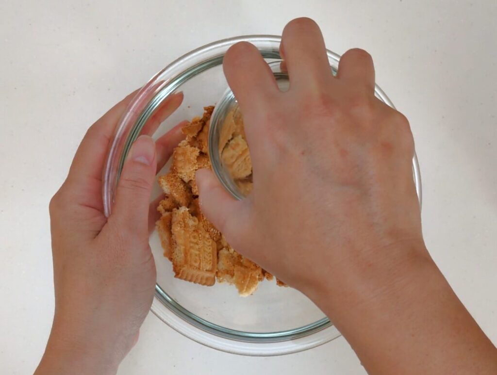 ①クッキーをボールに入れて、細かくなるまで砕き割る